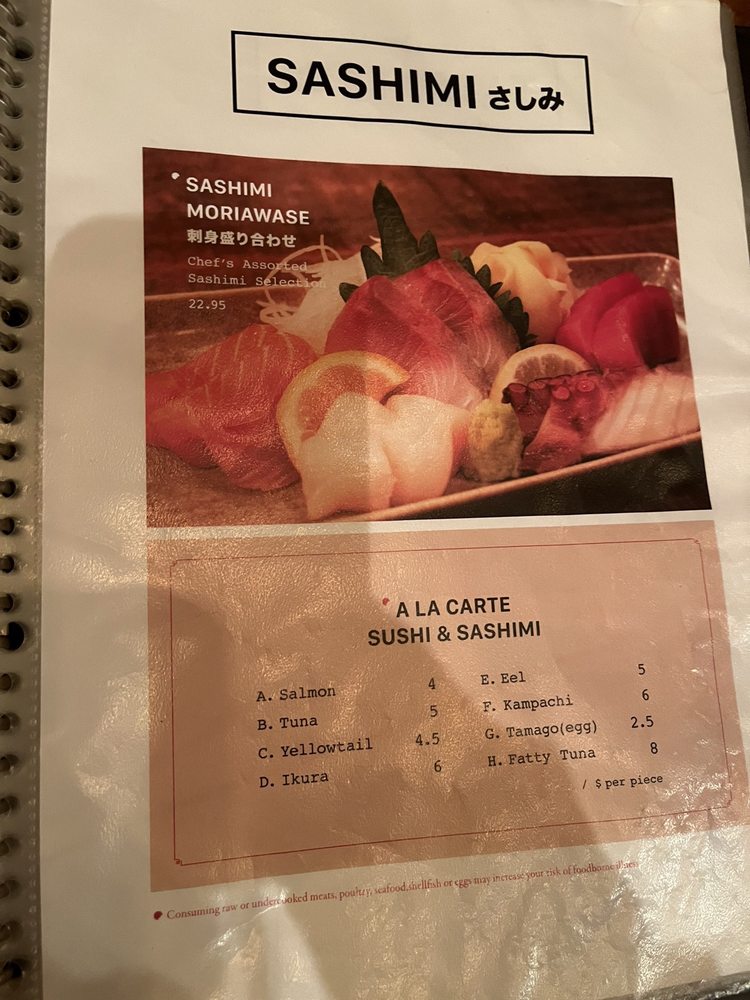 pieces of Sushi (Tuna, Salmon, Salmon Roe, Scallop, Yellowtail, Eel & Zuke Maguro), pieces of Spicy Tuna roll & tamagoyaki (egg). Comes with miso soup and salad.